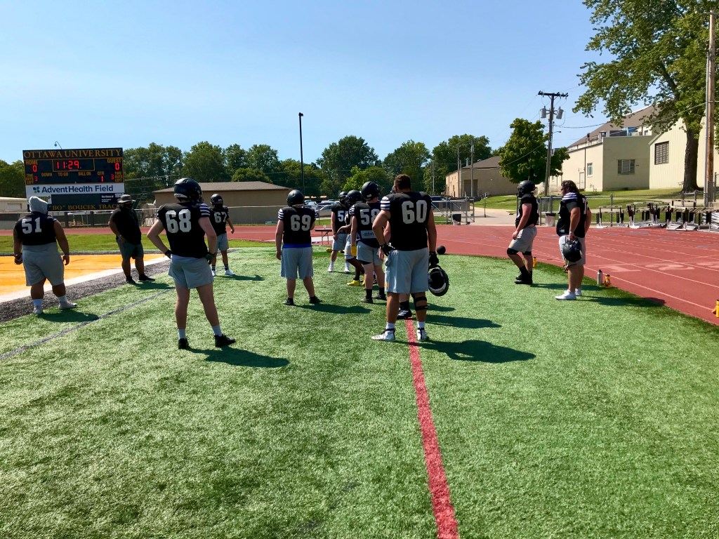The first practice to start week two of Football practice for the Ottawa University Braves was full of spirit and warm temperatures. The Braves worked hard on the fundamentals of both offensive and defensive schemes. It’s still early, but the team has shown positives so far. This next week will be challenging. The weather heats up with higher humidity and late August temperatures. Hydration and proper care will be key this week to keep the old injury bug from rearing its ugly head. If there were negatives from practice on Saturday, August 22nd, it might be discipline. Players are still learning their place on the field and that’s to be expected at this point of camp. It should get better as we inch closer to the first game of the season on September 12th. In the audio below you’ll hear Braves Head Football Coach Kent Kessinger’s thoughts on the first week of practice. What are the positives so far? What needs to be worked on? Plus you’ll hear his thoughts on the Quarterback spot. Check the audio out below.